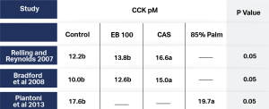 Published research work by Relling and Reynolds 2007 and Bradford et al 2008 in lactating dairy cows has shown similar results comparing EB 100 to CAS. EB 100 is a FA source containing mostly saturated FA high in stearic acid while CAS is primarily palmitic and oleic acids. CAS significantly increased CCK while EB 100 was similar to the control. Piantoni et al 2013 observed a significant increase in CCK comparing an 85% palmitic acid FA source to the control. These data suggest that FA sources high in palmitic and oleic acids increase CCK potentially leading to DMI depression, while a FA source high in stearic acid does not. These reports are shown in Table 3.