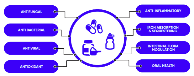 Lactoferrin is a whey protein fraction that occurs naturally in both bovine and human milk. First isolated in 1939 and used in infant formula since the ‘80s, it’s an iron-binding glycoprotein that’s also found in supplements, gummies and even dental products. Its most researched benefits are highlighted in figure 1.