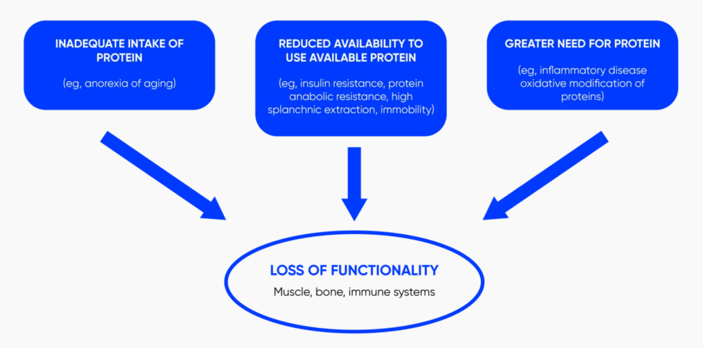 Dietary protein requirements increase with age, attributed partly to an increase in anabolic resistance to muscle protein synthesis (MPS), which accelerates loss of skeletal muscle mass and function. Maintaining muscle mass is essential to protect against falls, which are a leading cause of injury-related mortality in older people and a consequence of anorexia of ageing.