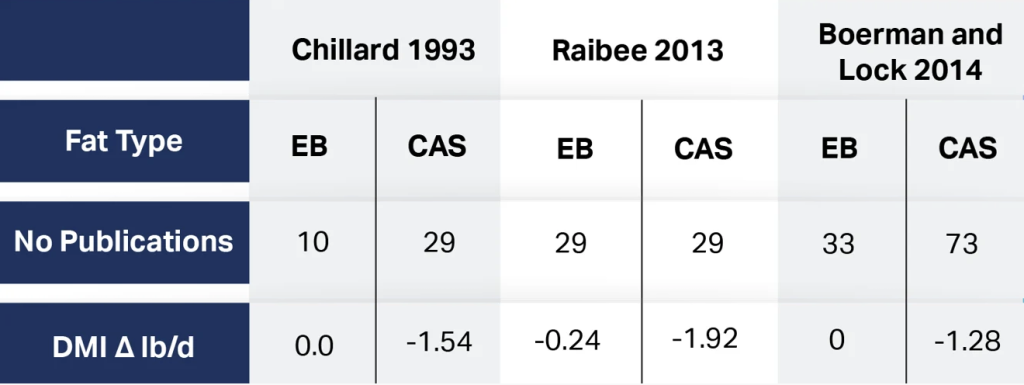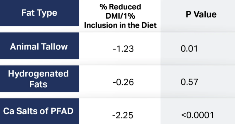 Allen, 2000 published a review on factors affecting feed intake including certain FA. Supplemental fat sometimes depresses feed intake due to effects of fat on ruminal fermentation and gut motility, acceptability of diets containing added fat, release of gut hormones, and oxidation of fat in the liver. Significant decreases in DMI were observed for Ca-PFA for 11 of 24 comparisons. In addition, Ca-PFA resulted in a numerical decrease in DMI in 22 of the 24 comparisons. Other sources of fat had less consistent effects on DMI and there were few significant decreases in DMI by added FA for each category of fat. A summary of these findings is illustrated in Table 1.