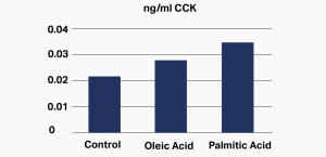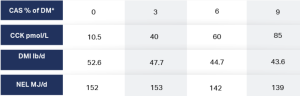 Choi and Palmquist 1996 observed increases in CCK and a consequent reduction in DMI when 0, 3%, 6%, or 9% CAS was added to the diet. Fat supplementation increased post-feeding plasma cholecystokinin concentrations and linearly increased plasma pancreatic polypeptide (GLP-1) concentrations. The effects of CAS on CCK plasma concentrations are reported in Figure 1.