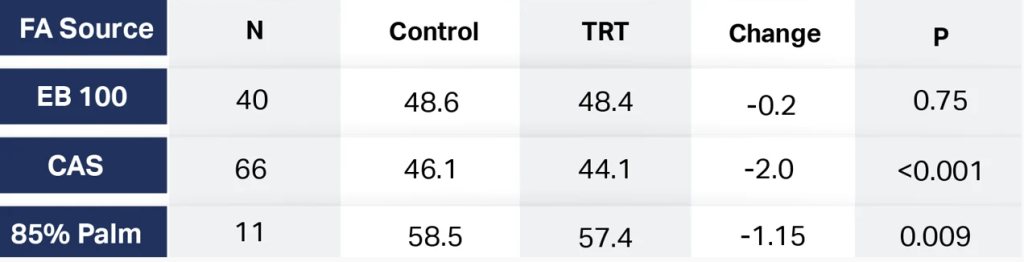 These published reports show the mechanism by which specific FA such as palmitic and oleic cause increases in CCK when fed to lactating cows. This in turn may lead to depressed DMI. To further investigate this hormonally modulated effect, a meta-analysis performed by Sellers et al. 2017 compared FA sources to the control. These findings are in Table 4.